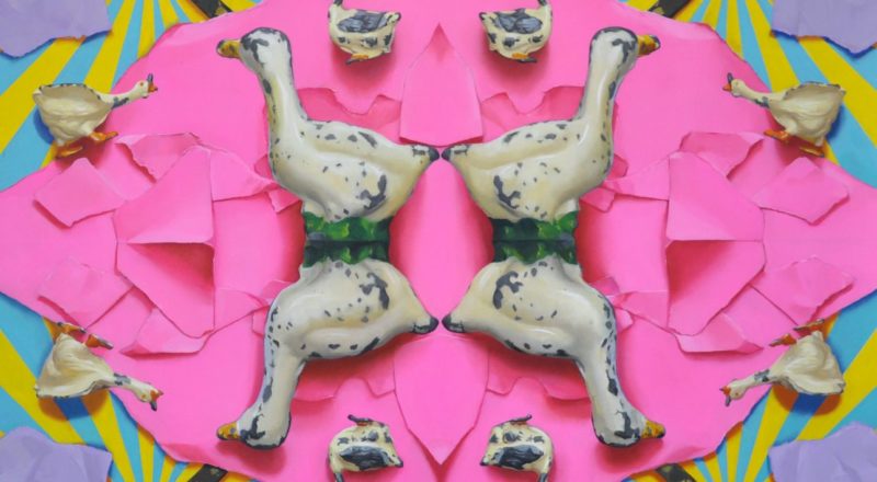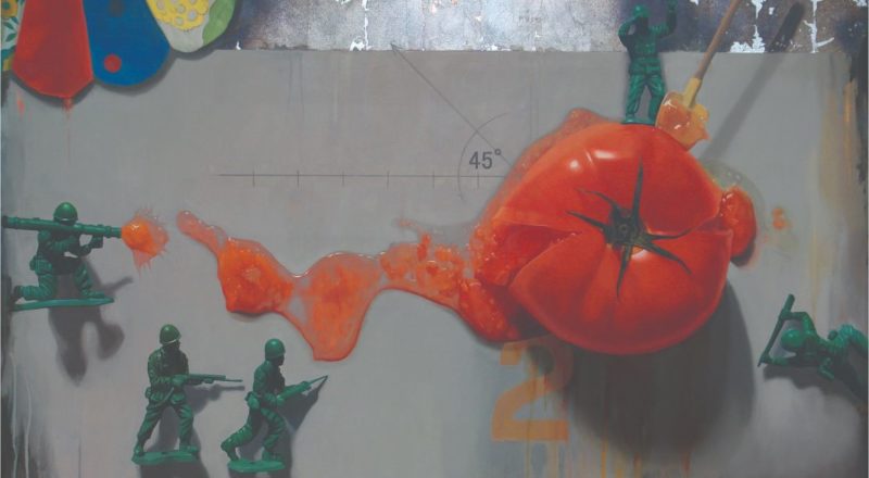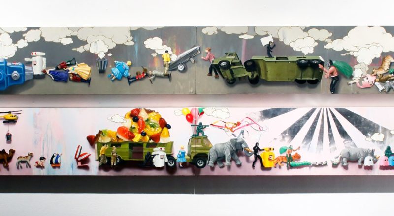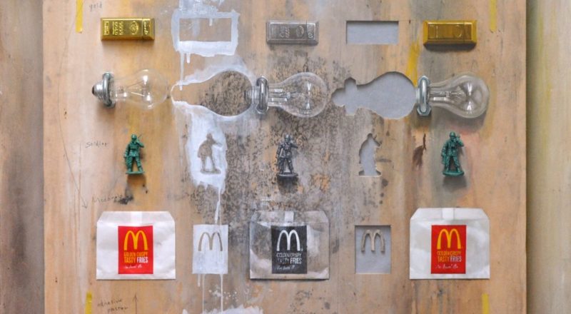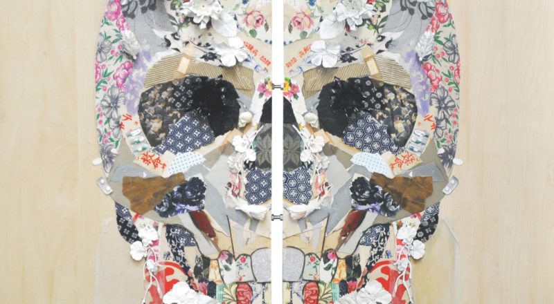 左側は現実にそこに存在し貼り付けられている「実像」で、右側は忠実に再現しようとした油彩による「虚像」である。おそらく時間の経過とともに左側のコラージュした素材たちは色褪せることもあるだろう、黄変し劣化し元あった形ではなくなってしまう。一方で「虚像」であった油絵はかつてあった「実像」よりも色鮮やかに残り続ける。